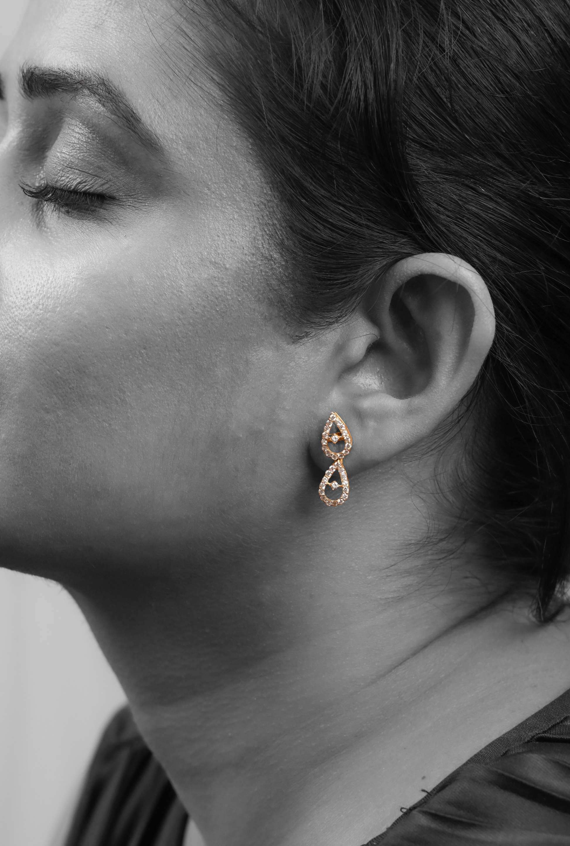 Two luminous forms descend in perfect symmetry, echoing the arc of a falling star or the final hush of twilight dew. These earrings, cast in 18k gold and weighing a mere 3.31 grams, embrace the weightlessness of light itself. Suspended within each golden silhouette is a pair of open teardrop motifs, their contours traced in precision-set white Swarovski crystals. The double-drop structure evokes a celestial duality — radiance and silence, gravity and grace. Poised yet ethereal, Celestial Drops are a quiet reverence to the sacred geometry of nature, captured in gold and light. A composition of devotion, engineered in miniature.