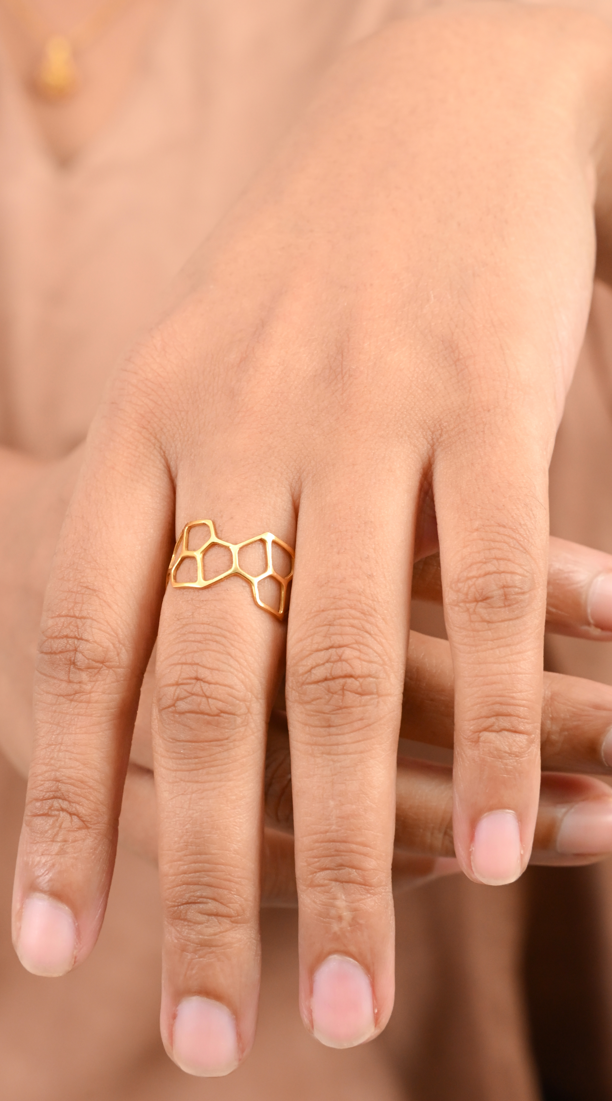 An intricate balance of structure and thought, Hivemind is crafted in solid 18k gold, weighing just 1.75 grams in size 24 — a feat of precision engineering and aesthetic restraint. Its openwork geometry evokes the cellular harmony of a hive: strong, calculated, and infinitely interconnected. Each facet echoes a quiet intelligence, forged not just to be worn but to be understood.