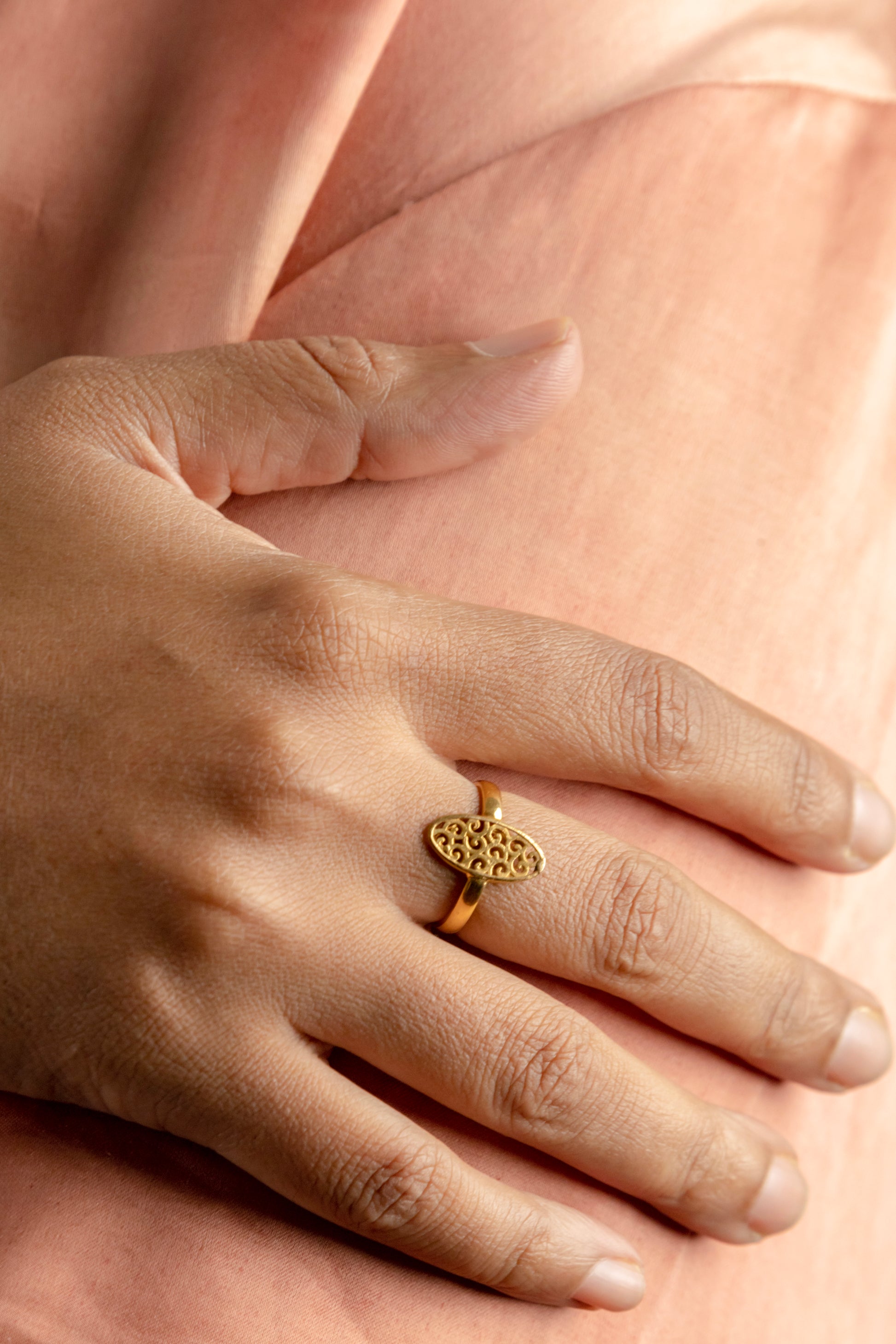 Light dances effortlessly across the surface of Lucent Filigree, an 18k gold ring weighing 2.71 grams and crafted in a delicate size 16. The elongated oval face is a lattice of arabesque scrolls — a weightless weave of openwork that evokes antique lace captured in gold.