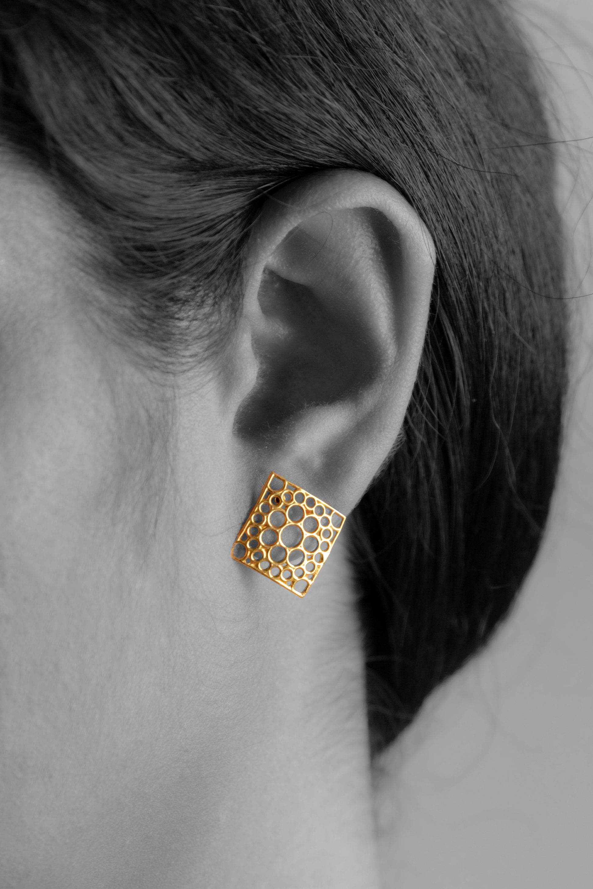 A study in golden precision, Oculus Aurea captures the delicate tension between structure and void. Sculpted in 18k gold and weighing 2.91 grams, these studs feature a square frame softened by a constellation of circular apertures — a visual echo of architectural rose windows and cosmic geometry. Light dances through the negative space, casting subtle shadows and highlighting the ethereal play of form and balance. Minimal yet intricate, this pair is a quiet ode to feminine clarity and sacred symmetry.
